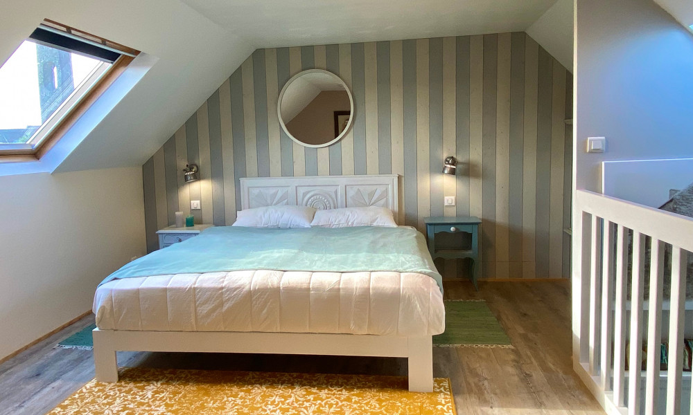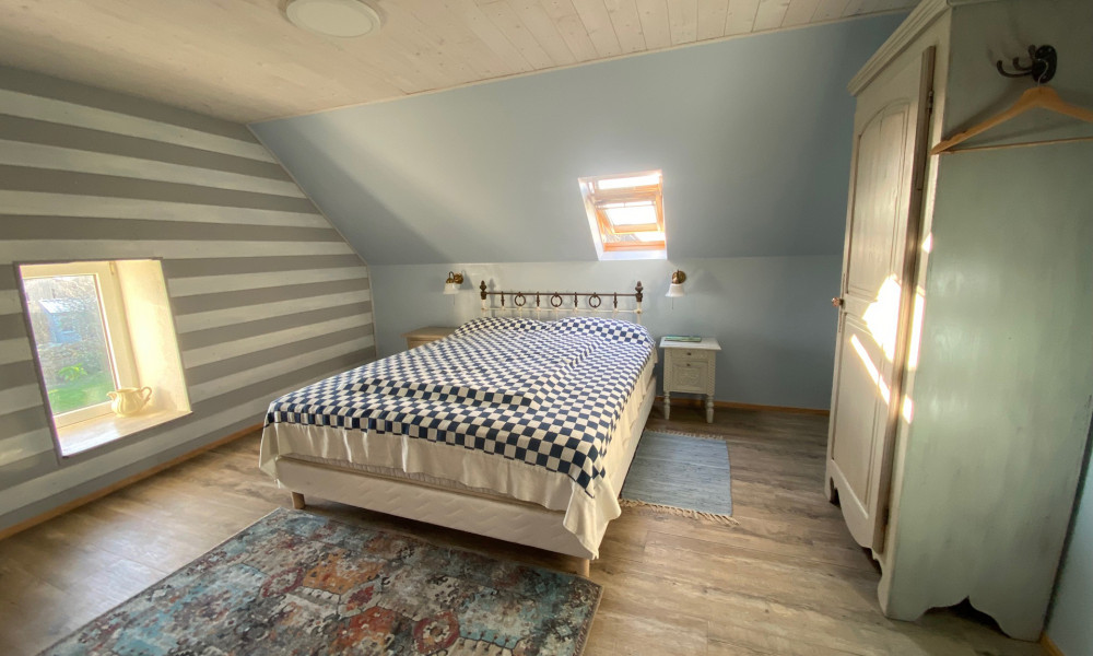 Im Obergeschoss befinden sich die beiden Schlafzimmer mit ausreichend Platz und großen, bequemen Betten. Hier schläft man entspannt ein und wacht erholt auf – mit frischer Luft und bretonischer Stille.