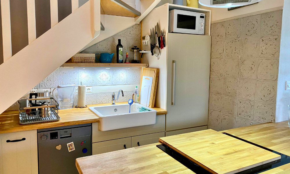 Die Küche ist vollständig ausgestattet und bietet alles, was man zum entspannten Kochen und Dinieren braucht – von reichlich Geschirr, Gläsern und Besteck, Kaffeemaschinen über Geschirrspüler bis zu Backofen und Induktionskochfeld.